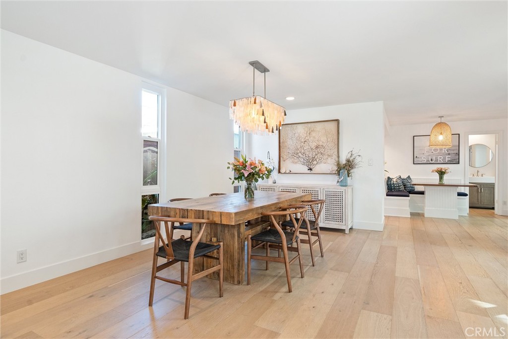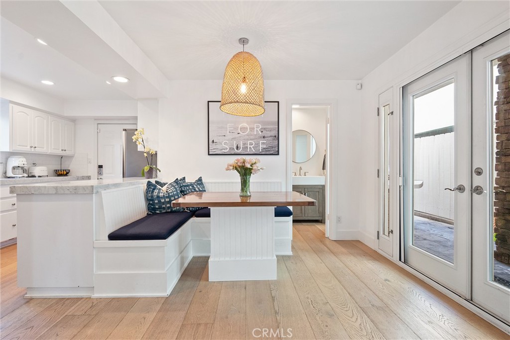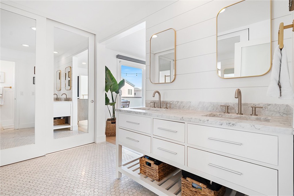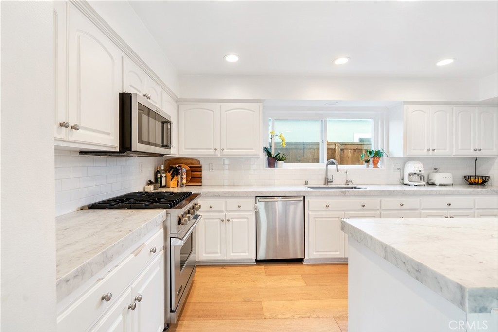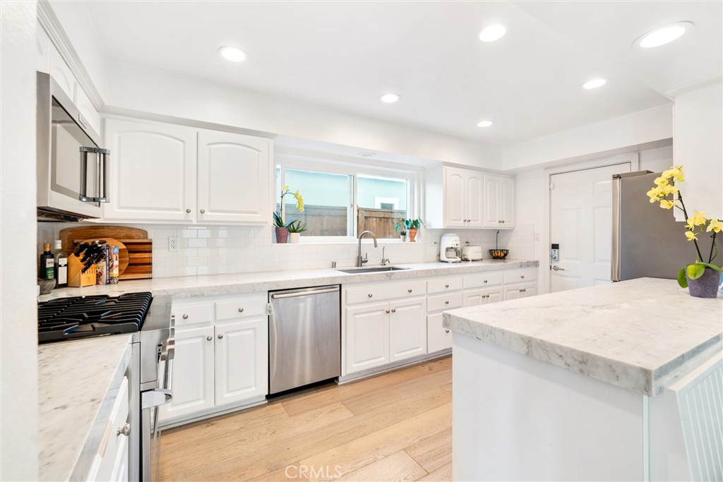 This exceptional remodeled four bedroom, three bath home is located steps from one of Newport's finest beaches. Featuring a stunning gourmet kitchen with slab Carrara marble counters, subway tile backsplash, Viking and Bosch appliances, custom cabinetry and a built-in banquette. The open living room and formal dining room offer hardwood flooring, custom lighting, and a fireplace as well as French doors leading to a private patio which are ideal for entertaining. The primary suite includes his and her closets and a well-appointed ensuite bath featuring stone counters, a custom dual sink vanity, and a walk-in shower. The other three spacious bedrooms include custom windows with high ceilings, and built-in closet systems. This home offers a second story deck complete with a Jacuzzi spa which is a welcomed opportunity to enjoy the ocean breezes. It includes a main floor full bath with private entry, and an outdoor shower. This is convenient after beach time as is the oversized two-car garage with extra space for surfboards, bikes, and general storage. This home also offers luxury furnishings, central air conditioning, a sound system, and a washer/dryer. Enjoy beach living as well as the amenities of the Newport Shores Community Association pool, clubhouse, tennis, pickleball, basketball, volleyball, play area, and BBQ.