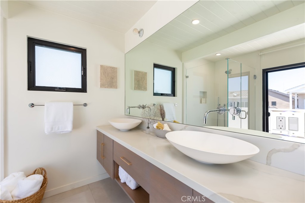 Experience luxury beach living in this impeccable masterpiece, meticulously designed by award-winning Laguna Beach Architect Walter Metez. Perfectly positioned just two blocks from the beach in the highly sought-after 400 block, this stunning residence is a testament to unparalleled craftsmanship and sophistication. It features an open concept kitchen with quartz countertops, subway tile backsplash, custom Alvic LaserTech cabinetry, top of line Thermador appliances, Zephyr Range Hood wrapped in custom oak, and an impressive kitchen island. The kitchen and living room are each framed with a set of custom pocketing doors allowing seamless flow for indoor/outdoor entertaining as well as an abundance of natural light. This home also offers an inviting master retreat with beamed ceilings, a private deck, and an incredible spa-like bath with a Picasso Maestro Collection Thermal Air bath, walk-in frameless shower, custom floating double vanity with quartz countertops, California Faucets, and a separate water closet. There are two additional spacious bedrooms and two additional well-appointed baths boasting custom cabinetry and stone work. Other amenities include: wide plank light oak hardwood flooring, porcelain flooring, central air conditioning, water softener and filtration system, all new plumbing with tankless water heater and new sewer line, all new electrical with energy efficient LED lighting, gas fireplace, exterior smooth coat stucco, Western windows, two-car garage, and much more. Enjoy luxury beach living as well as the amenities of the Newport Shores Community Association - pool, tennis, clubhouse, basketball, volleyball, BBQ, and play areas.